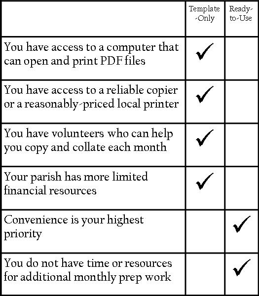 It occurs to me though, that this might be a good time to step back a bit and explain the options. Family Formation is available in two format options for parishes. With the Ready-to-Use Option, everything is printed, bundled up, and sent to you each month. All you need to do is package it for your specific families and distribute. With the Template-Only Option you receive a CD each month containing all the Home and Classroom Lessons together with permission to print for the registered families in your parish for a specific year. Both options have their pros and cons, depending on your situation, and perhaps the following chart will help you decide: