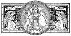 - November 21 is the Feast of Christ the King and this is the perfect time to decorate your prayer center for a king! The official liturgical color is white, but gold would also be very appropriate. You can purchase gold fabric at many fabric stores if you have a way to hem it, but you can also get shiny gold paper doilies at party supply stores, if you’d like to go an easier route. (Look in the 50th anniversary section.) Do you have a shiny gold costume crown, gold candles, or any other gold (polished brass) accessories? This is the time to bring them out! I had a surprisingly difficult time finding art for this one, but you might enjoy making your own art with this picture of Jesus Christ, King of kings.