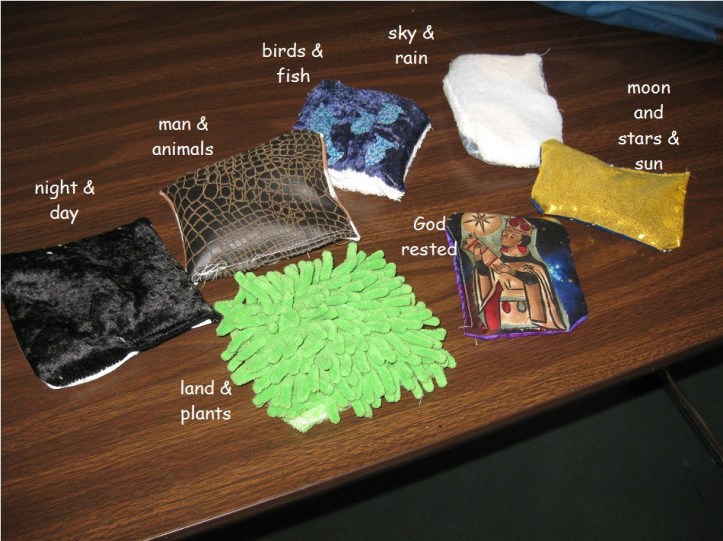 I think it was pretty simple. As she told the story from Genesis, she used each beanbag to illustrate the concepts. “In the beginning the earth had no form and darkness covered everything” (while showing the black side of the first beanbag, “and when God spoke the words ‘Let there be light,’ there was!” (white side)”And on the first day of creation, God created night and day.” At that point she passed the beanbag around so the kids could feel the textures and see for themselves, and so on throughout the story. Later in the class time, she was able to effectively use them for review because the kids had heard, seen, and touched this lesson. It just added an extra element that helped them remember.