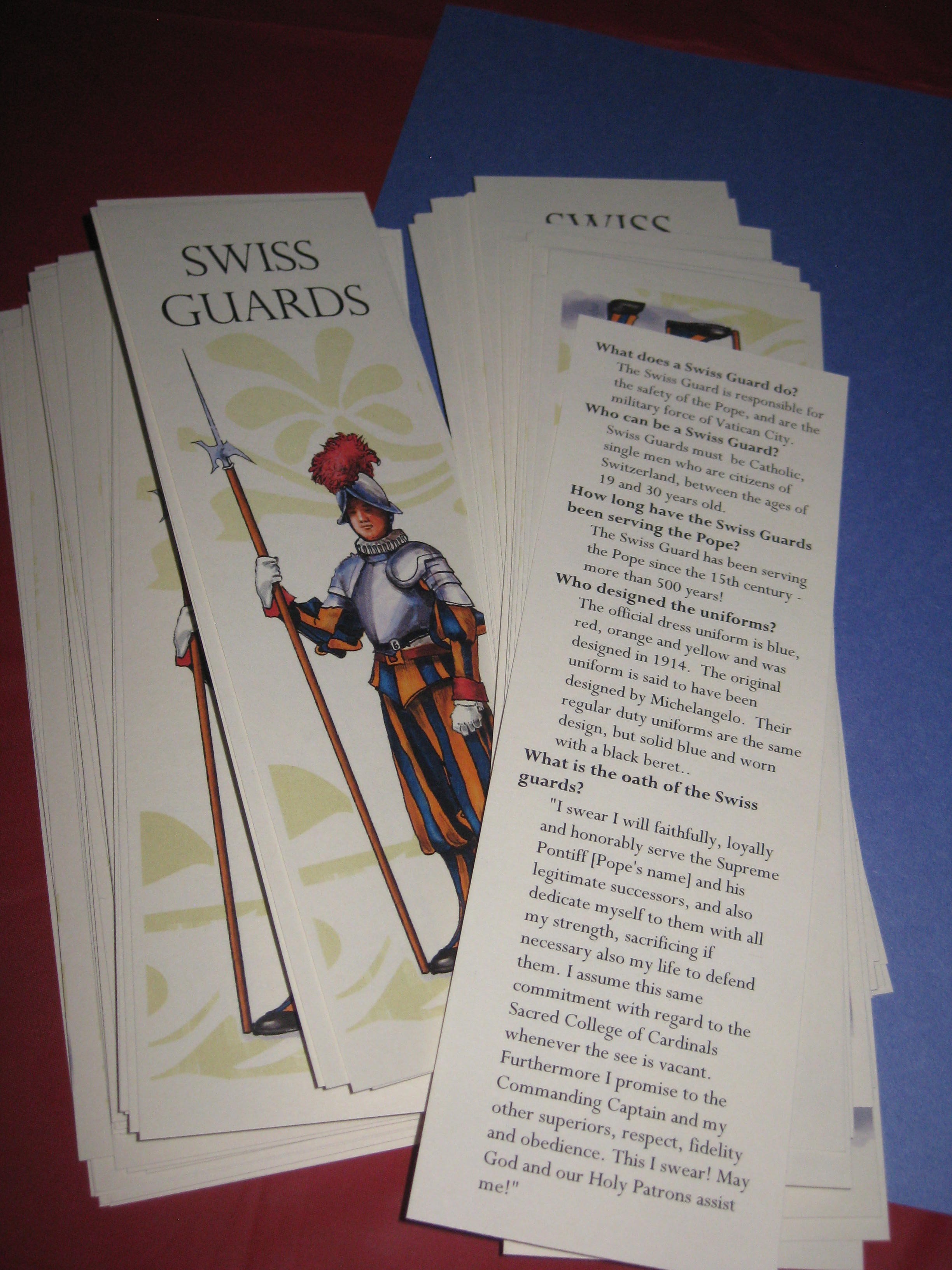 He’s wearing a Swiss Guard uniform – you can learn more about them on the Vatican website or on the bookmark kids picked up this month.