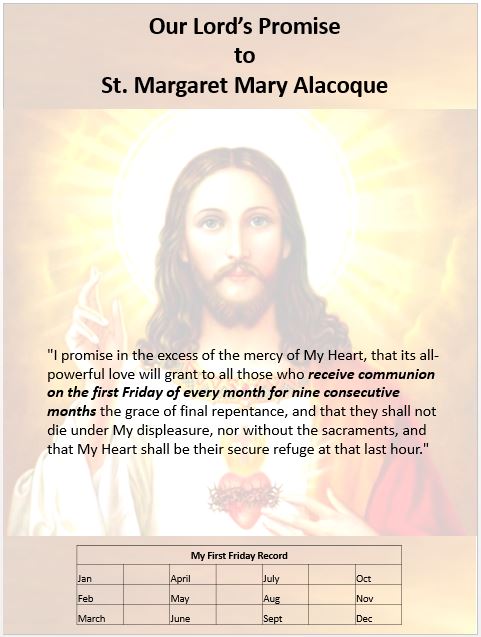 First Friday Devotions were derived from revelations made by Jesus to Saint Margaret Mary Alacoque and include the practice of receiving Holy Communion on nine consecutive First Fridays of the month in reparation to “the Heart that has loved men so and is loved so little in return” (Words of Christ to Margaret Mary). Among the graces Christ is said to have promised to those faithful to this devotion are: final perseverance in the Catholic Faith, reception of the last sacraments, death in the state of grace, and the consolation of the love of Christ’s Sacred Heart at the time of death.
