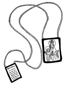 On this feast we remember when Mary first gave the scapular to a monk whose name was Simon Stock. A scapular was originally part of a religious habit and looked like a piece of cloth worn over the shoulders like an apron. The front and back portions of this original scapular were fastened together under the arms by straps which gave it the shape of a cross. In the course of time the scapular the a reduced form of the scapular came into use for people who weren’t in a religious order to wear. Many people still wear scapulars today. Instead of being large and shaped like a cross, this version is small and worn over the shoulders to symbolically represent carrying the cross of Christ.