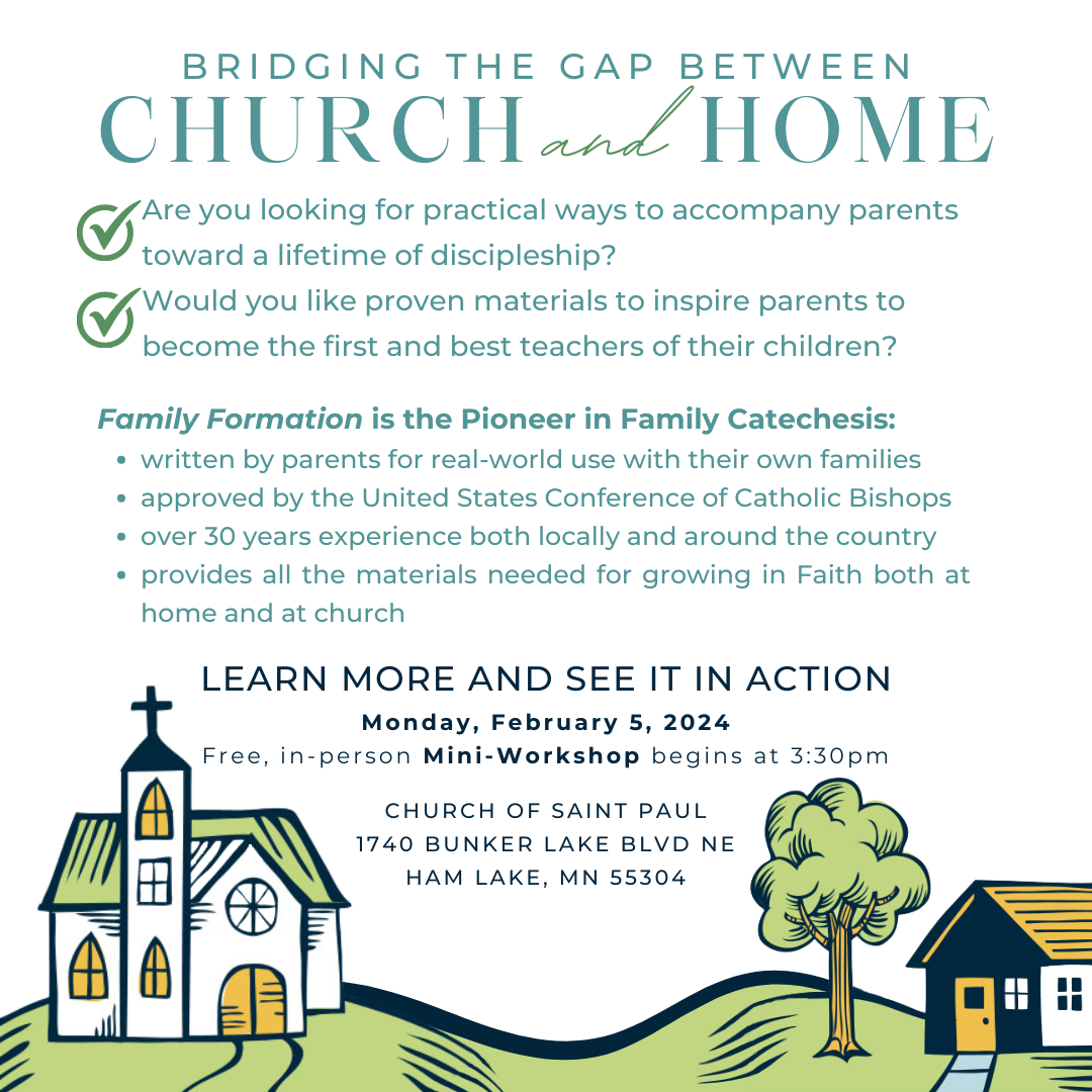 We have two in-person workshops coming up soon! This one (February 5) is on a Monday afternoon/evening, and the other (April 6) is on a Saturday. Both include general information on family catechesis, specifics on Family Formation, a meal, and an opportunity to see Family Formation in action with our own families in session at their monthly at-church meeting. If you would like to join us, or know someone else who would, we would love to see you there! RSVP and get more details at familyformation.net/