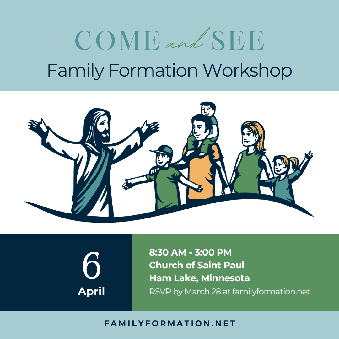 Want to learn more about bringing family catechesis to your parish? Come see Family Formation in action and get more details at the annual “Come and See” workshop on Saturday, April 6. No cost and includes a continental breakfast and lunch. RSVP by March 28 and visit familyformation.net for more information. We’d love for you to join us!