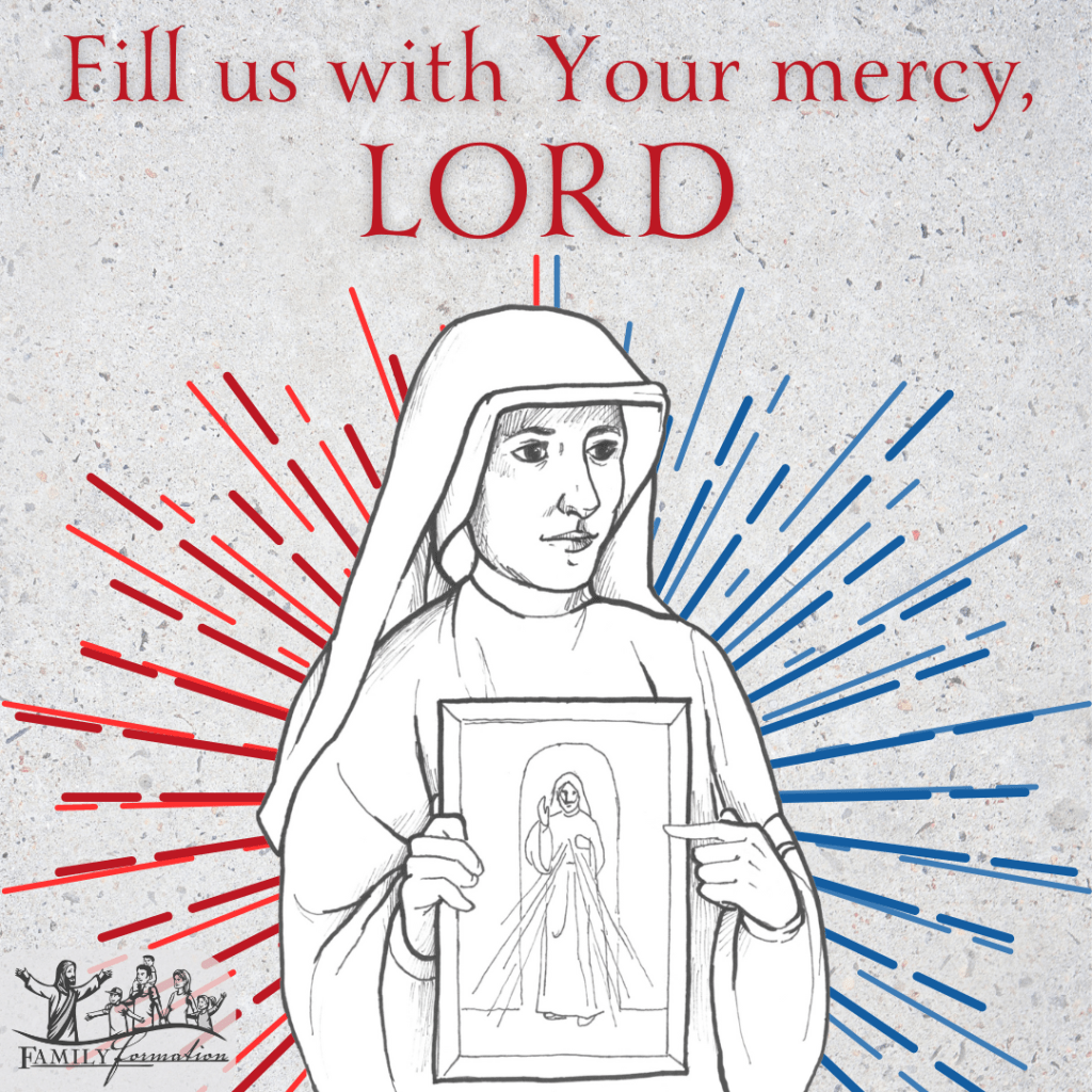Fill us with your mercy, Lord. Please forgive us our sins, and give us the grace to be merciful to one another in our deeds, words, and prayers. May the rays of mercy that go forth from your Heart reign in our home and in our hearts. Please make our home a place where your mercy can rest and where we, too, can find rest in your mercy. Bless us with your mercy when we leave our home and bless us again when we return. Bless everyone we meet with the mercy you pour into our hearts. Especially bless those who visit our home — may they experience your mercy here.