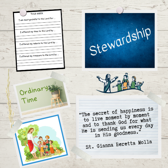 Stewardship is the idea that all good things are gifts from God and He entrusts them to us for care and wise use. Pretty nice, eh? Parents, this is one area where your Christian witness really speaks volumes, for better or worse. I guarantee your kids know when you share, and give, and help others. They see what you put in the Sunday collection, how you use your time, and what you spend on other things. This is definitely your chance to talk with them about all those choices. Why do you volunteer here and give there? Have you heard God calling you to those actions?