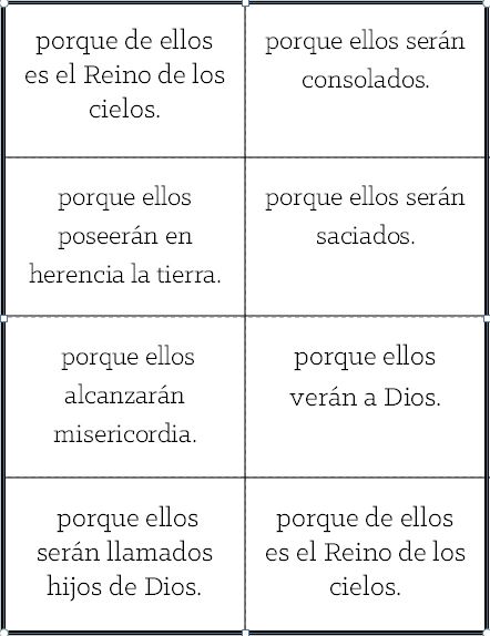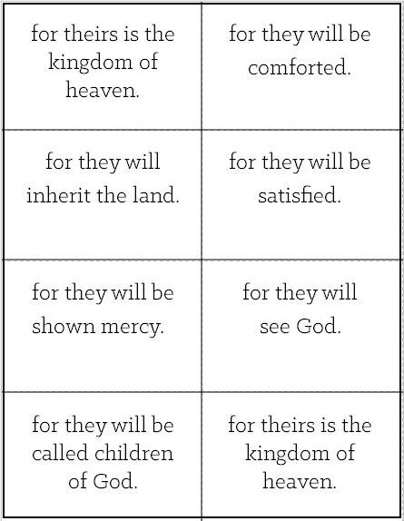 I’d like to recommend some very simple ways to break it down and make it more manageable. Each of the eight Beatitudes follows a predictable pattern. Each starts with a statement saying who is blessed and ends with why. Try making two pages of flashcards like those below (or simply click here Beatitudes flash cards – or here for Spanish, and print) and work on the following challenges: