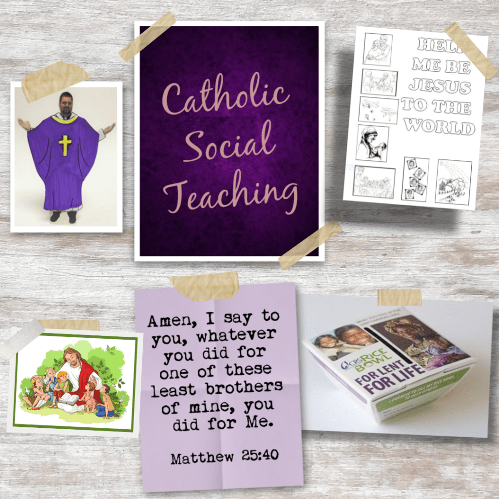 The basic starting point for the lesson is the coloring book, Help Me Be Jesus to the World, where you’ll not only find pages to color, but explanations, action points and Scripture quotes on each of the seven principals of Catholic Social Teaching outlined by our bishops.