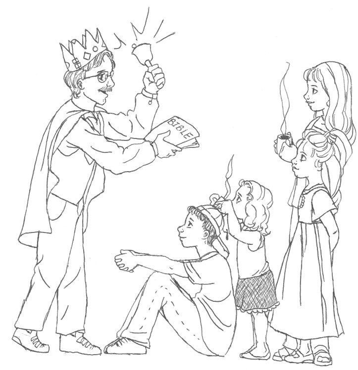 Dad was really getting into his storytelling now. With his bell fiercely ringing, he went on. “The king kept inviting everyone, ‘Come to my party!’ but the people were being rude. They ignored the king and insulted his servants. So the king said to his servants, ‘The people here aren’t fit to come to my party. Go tell the people in other towns and along the roads that I have a great party prepared!’ So the servants of the king went outside the city. ‘Come to the party!’ the king’s servants told everyone, and the people filled the hall.”