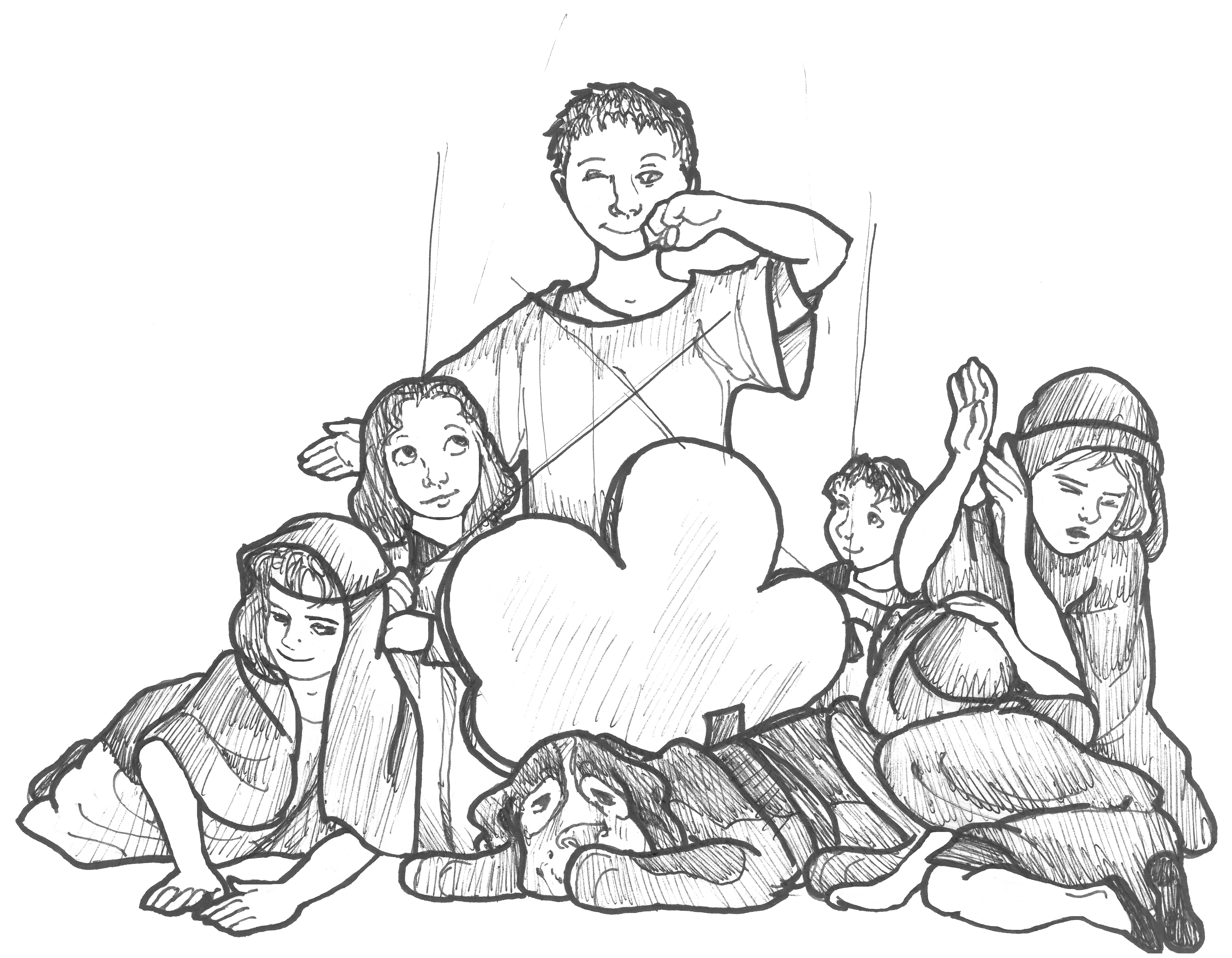 The kids came into the living room after breakfast this Sunday morning and KNEW what was going on. On the floor were scattered white and colored garment cloths, a cut-out figure of a cloud, and seven large halogen flashlights (those are the kind with the brilliant, high-powered light).