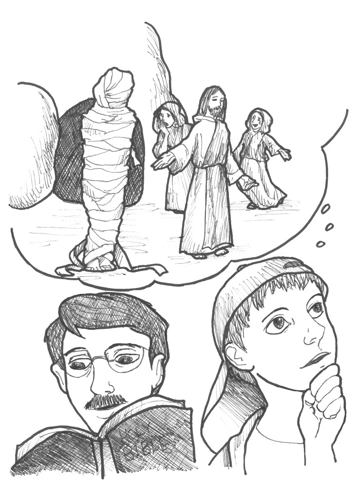 “Exactly right!” Dad agreed. “Jesus, the Lord, works a miracle today in our Gospel reading. Now who was the one brought back from the dead? Remember, Jesus called for him to ‘Come out!’ “