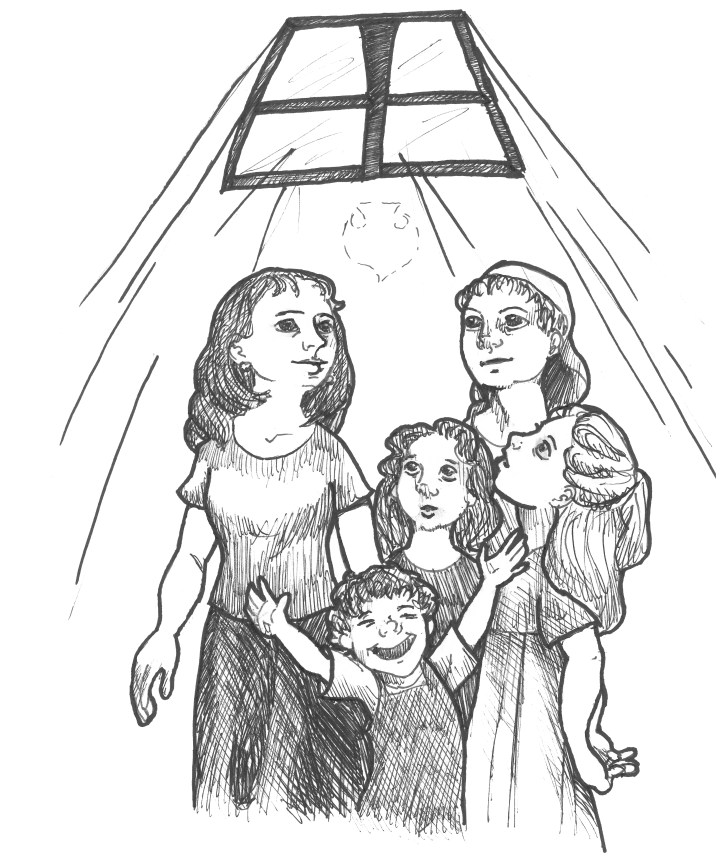 When the Pauline children came downstairs this morning, two things immediately caught their eye. One was the glowing light of six taper candles. Each of these candles was a little different. Some were still pretty tall, some of the others were burned down a bit. The other unusual thing was how the skylight in the front hall was covered with a cloth. The cloth was loosely taped to the skylight, and an odd-looking string hung down from the middle of it.