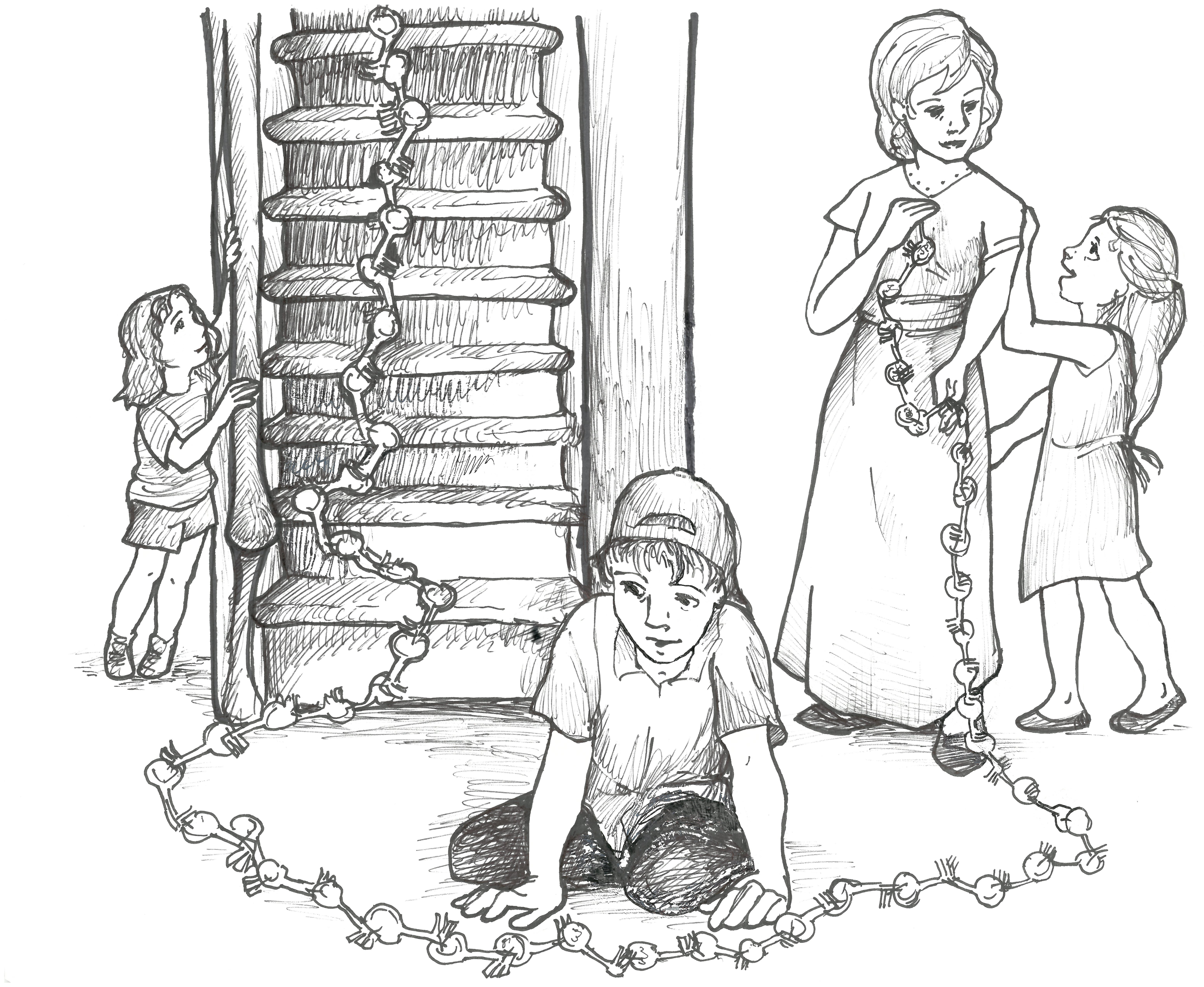 Something caught everyone’s eye under the cross in the dining room. What was that? It looked like a scroll of rolled up paper in funny shapes. Now what were Mom and Dad up to this time?