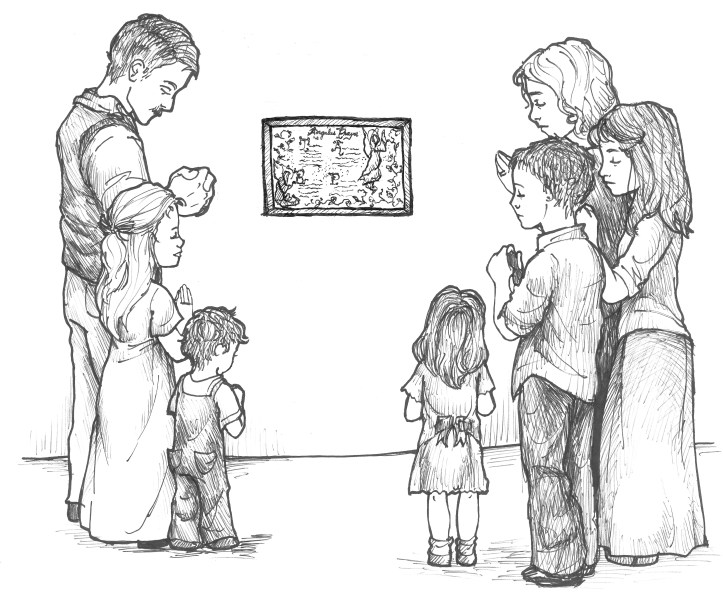 Nine months until Christmas! This morning the Pauline children awoke to find a “pre”-Christmas present adorning the living room wall. An 11-by-14-inch gold-framed copy of the Angelus prayer had been hung up overnight. It was beautifully detailed with scrolling letters, bright colors, and little angels.
